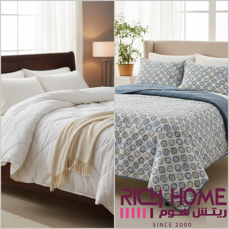 إذا كنت تبحث عن دفء إضافي في الشتاء، فاختر طقمًا من محل مفروشات ريتش هوم يحتوي على لحاف أو كوفرتة سميكة، أما للمناخ الدافئ فاختر ملايات وأقمشة خفيفة تسمح بتهوية جيدة.
